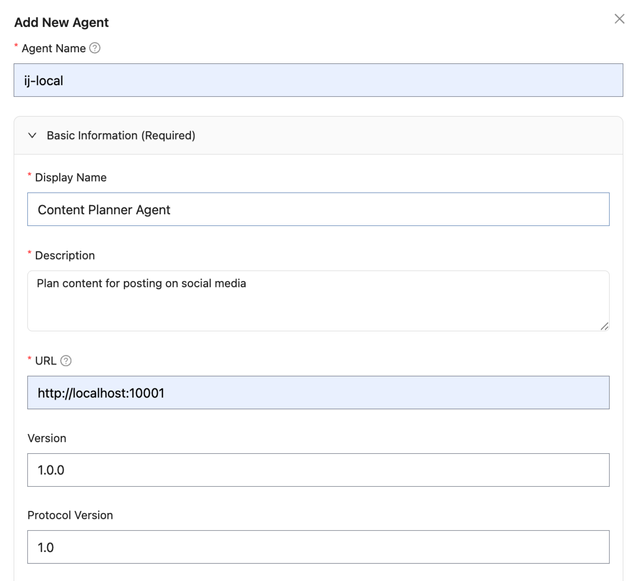 The URL should be the invocation URL for your A2A agent (e.g., http://localhost:10001).